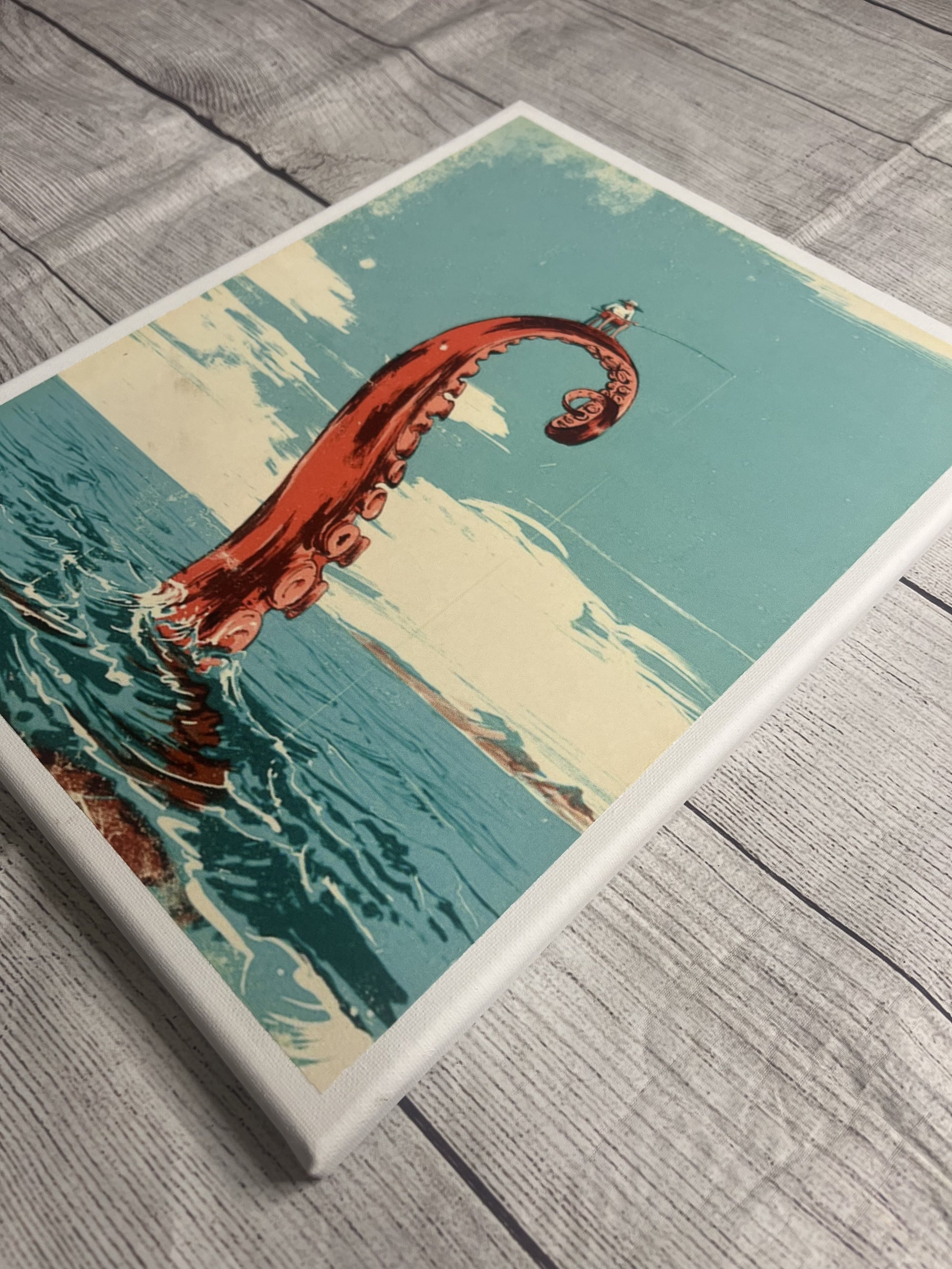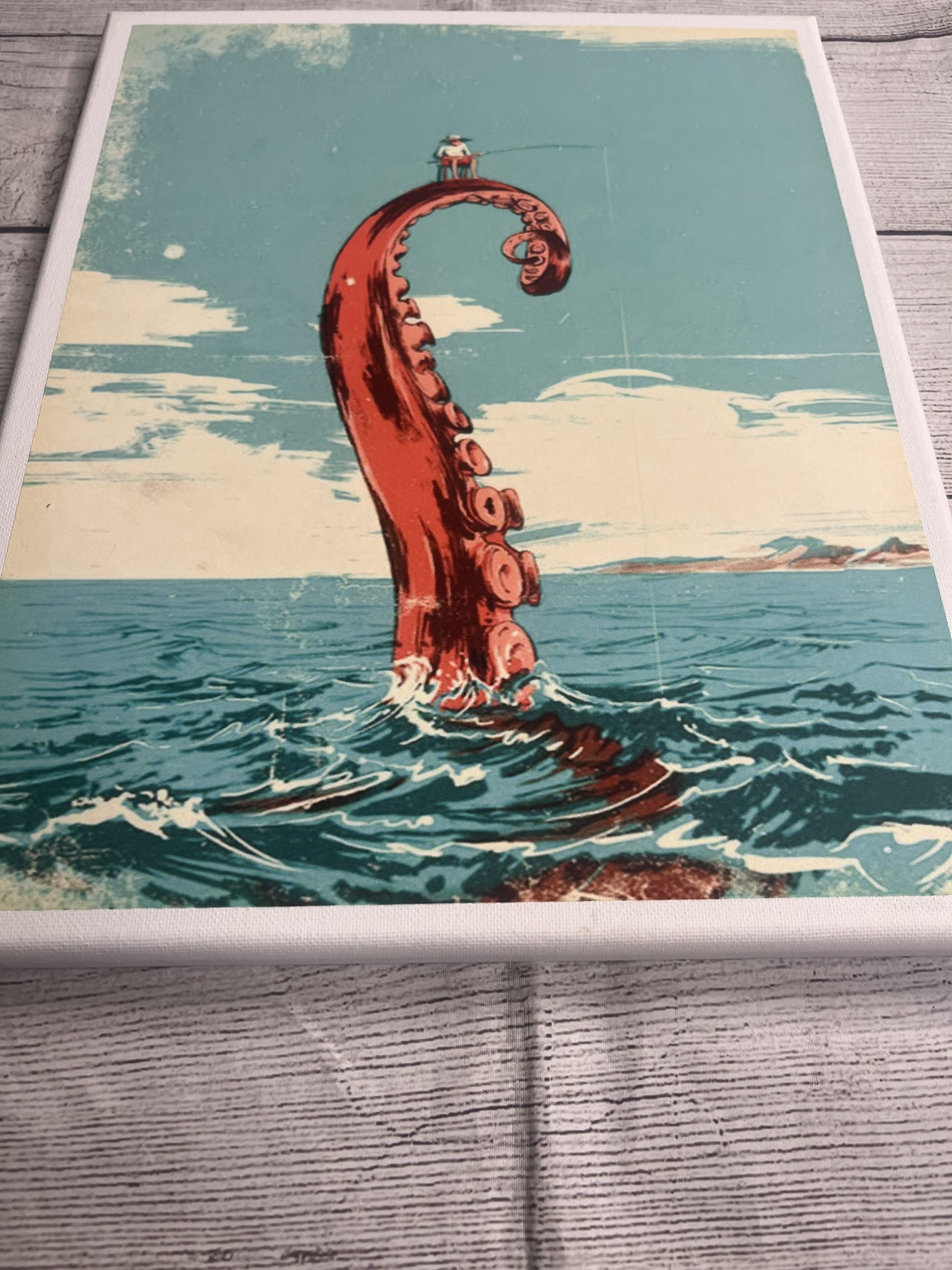 Cast your line into the surreal with this captivating Gone Fishing Canvas Wall Art! Featuring a lone fisherman perched atop a massive kraken tentacle, this whimsical piece blends fantasy and tranquility in a truly unique way. Perfect for ocean lovers, fishing enthusiasts, and anyone who appreciates art with a twist of the unexpected.