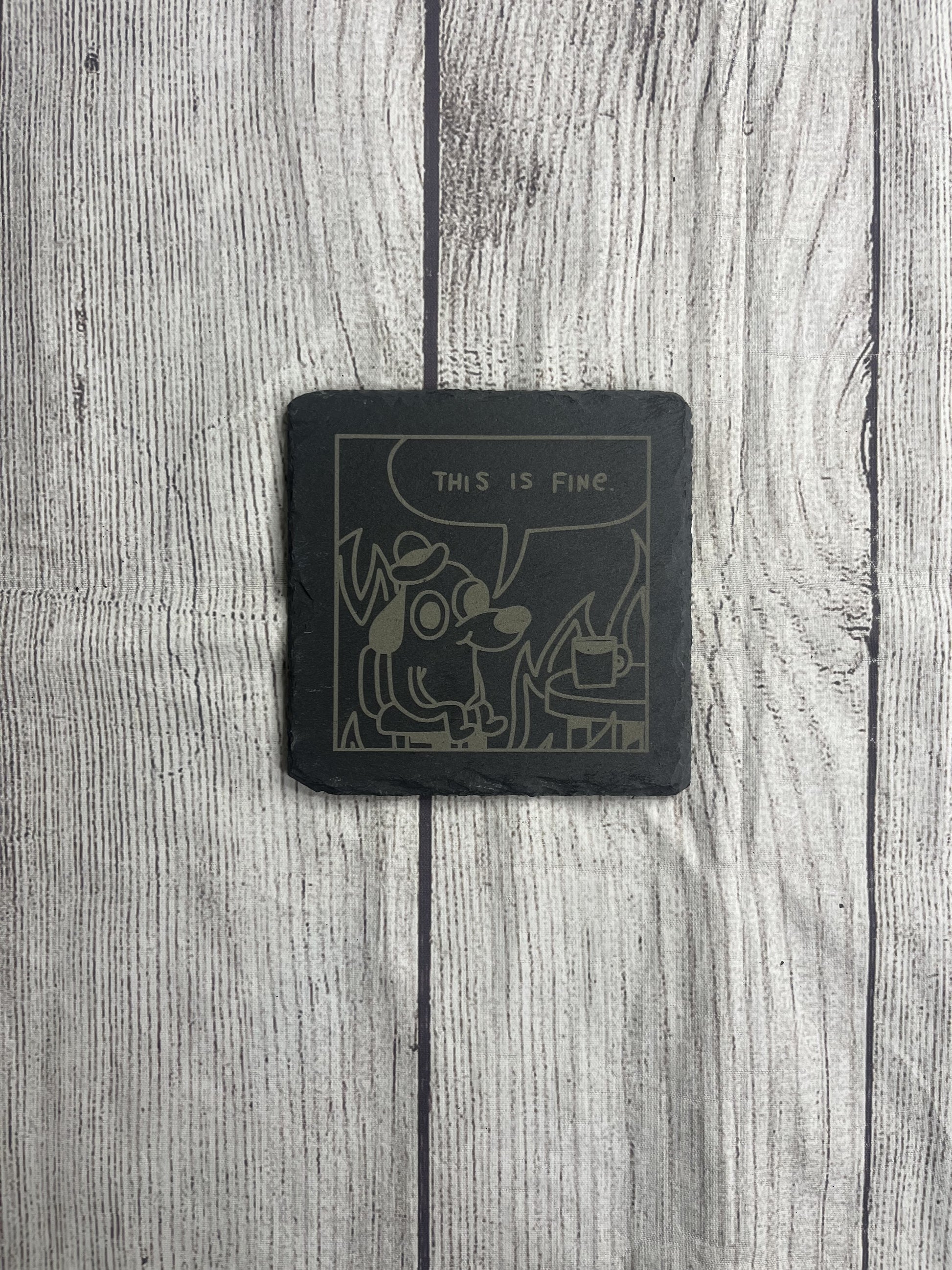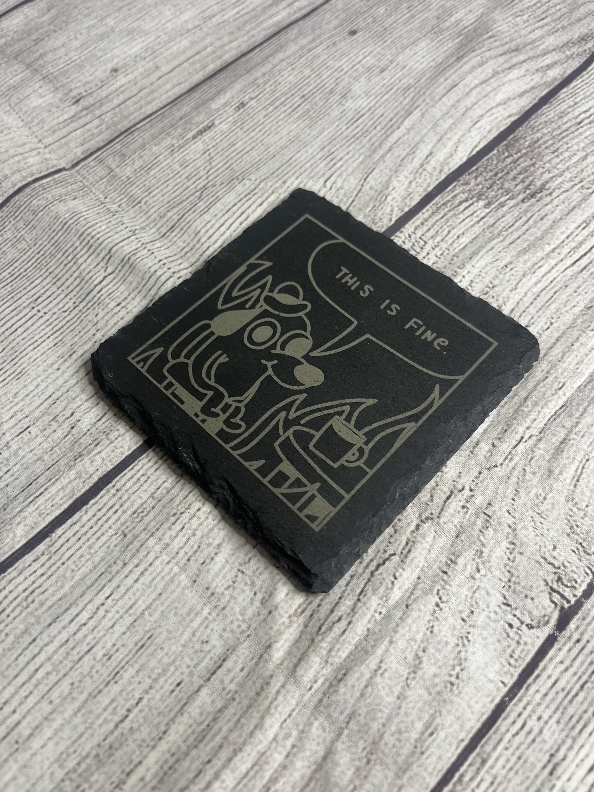 Perfect gift for internet culture enthusiasts, stressed-out friends, or anyone who appreciates darkly comedic, functional art. These durable slate coasters are built to last through whatever chaos life throws your way. This is fine. Everything is fine.