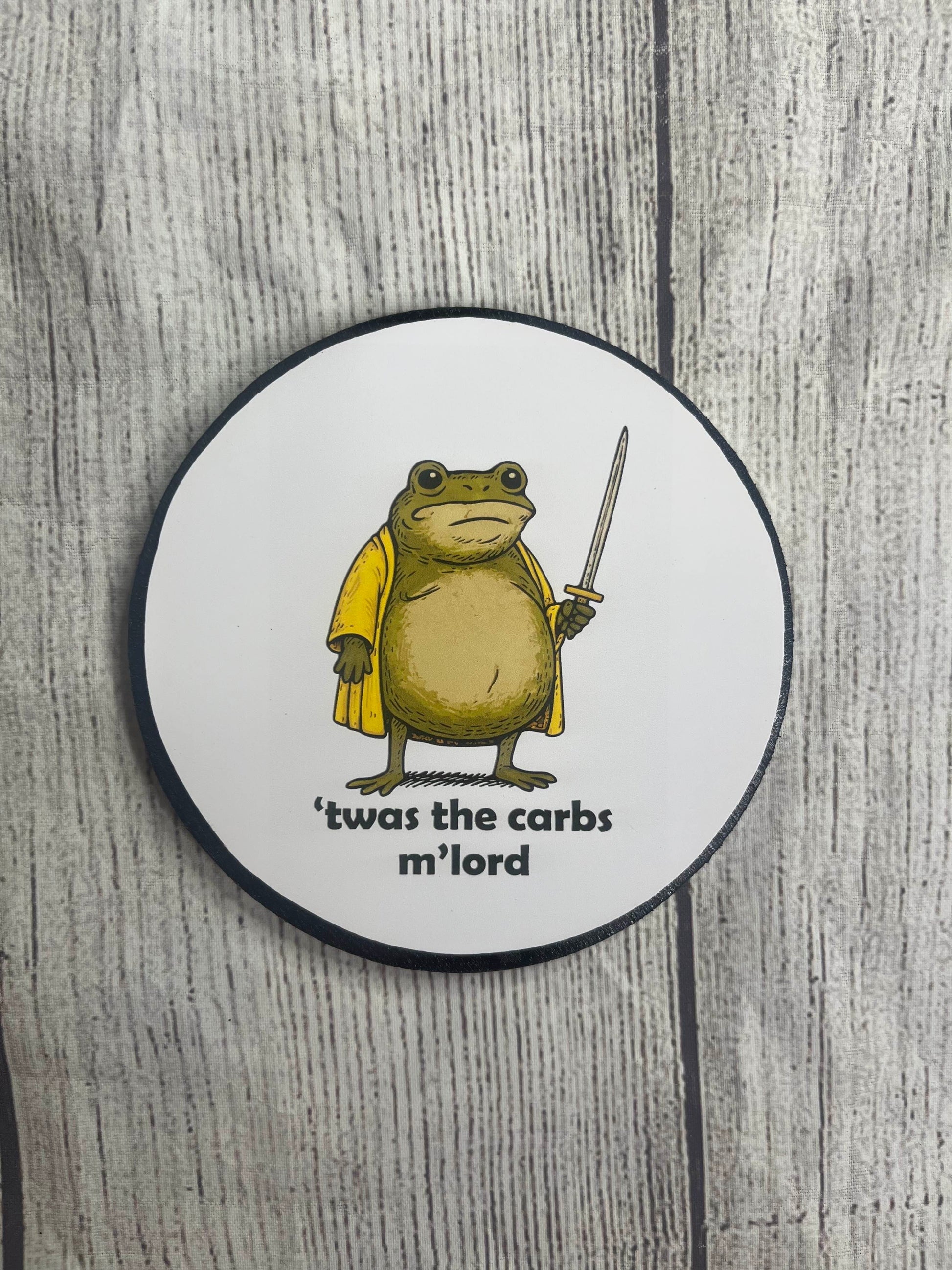 Declare your loyalty to the bakery with this hilarious " 'Twas the Carbs M'lord" Frog Epoxy Resin Wood Coaster! Featuring a noble, stout frog knight ready for battle (or a snack), this handcrafted coaster is the perfect gift for meme lovers, fantasy fans, and anyone who appreciates a good carb-related pun.