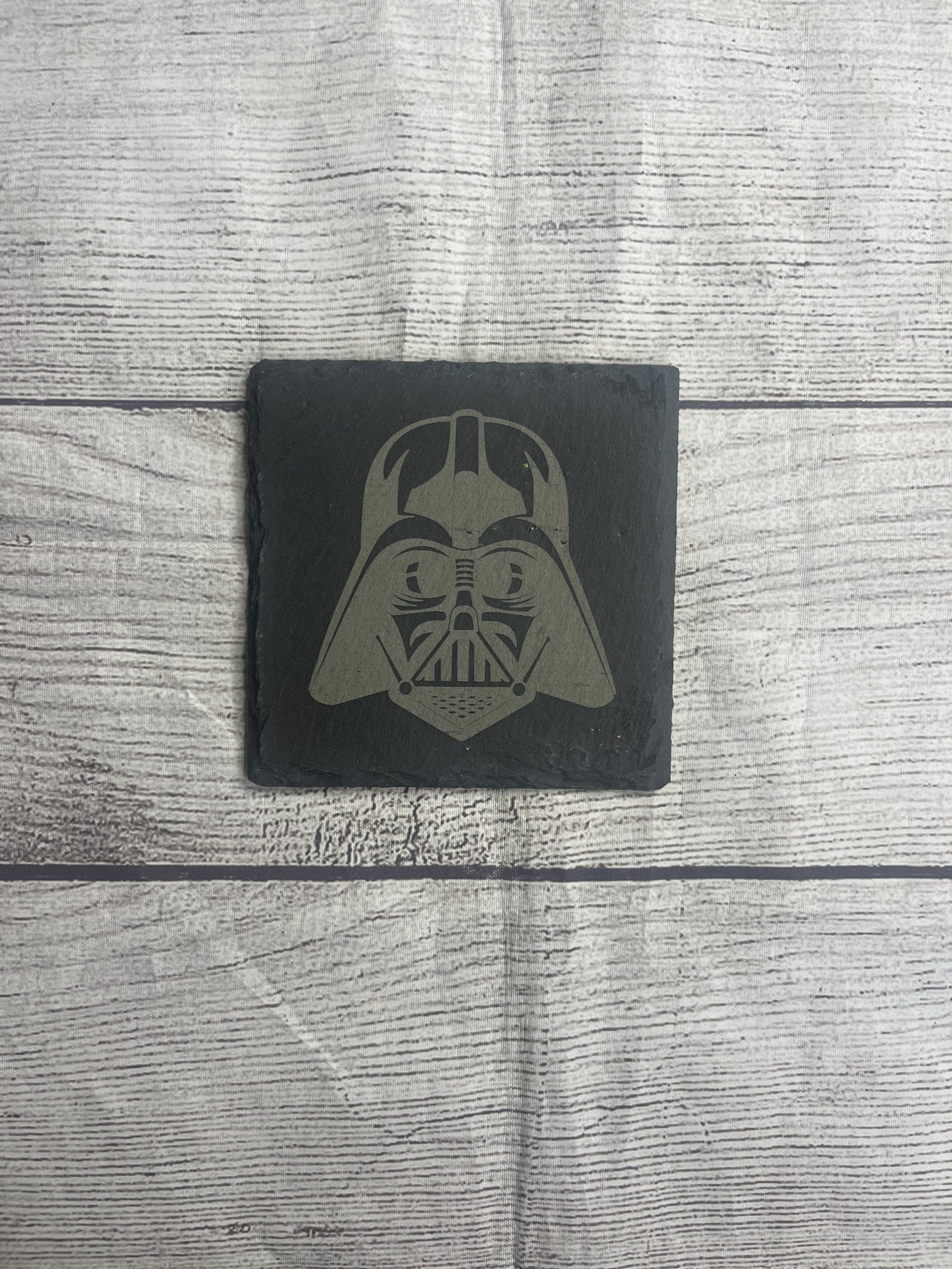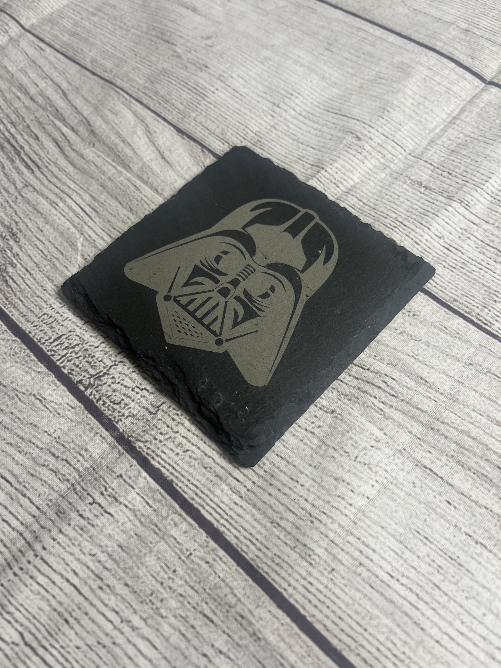 Embrace the dark side with these Villain Helmet Laser Engraved Slate Coasters. Each 4x4" natural slate coaster features precision laser-engraved designs of the iconic helmet from the legendary movies, bringing the power and mystique of the galaxy's most feared villain to your home.
